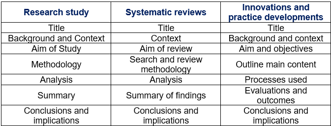 All abstracts should be informative and concise. The table below provides an outline structure for each of the abstracts categories.